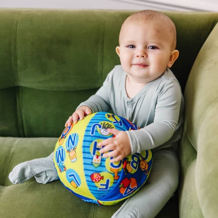 2-in-1 Talking Ball Learning Toy toss it back and forth to hear this amazing ball say the ABCs or count to 10! Just flip a switch to select the mode you prefer, then turn the reversible fabric panels to highlight counting quantities, alphabet artwork, and bright colors and patterns. Designed to delight kids of any age, the pleasantly noisy ball is perfect for indoor tossing, catching, kicking, and rolling, helping babies, toddlers, and preschoolers develop gross motor skills as they play. The layered graphics also offer lots of detail to engage children’s minds as they grow, gently introducing more advanced concepts such as odd and even numbers or vowels and consonants in a graphical way, and inviting exploration and discovery at a child’s own pace. It’s a wonderful way to introduce early-learning concepts in a playful, physical way that’s perfect for young children! (Play tip: Listen for auditory surprises to cue more laughter along the way! ) Melissa & Doug K’s Kids toys nurture early childhood development in three key skill areas: physical, cognitive, and social. With interactive designs and multisensory features, K’s Kids promotes constructive play and effortless learning, keeping interest high and new skills flourishing throughout the baby and toddler years!