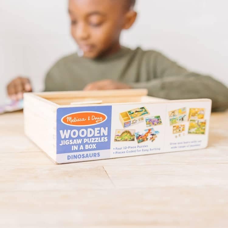 Dinosaur Jigsaw Puzzles in a Box set includes four wooden, 12-piece dinosaur jigsaw puzzles– a triceratops, an apatosaurus, a stegosaurus and a T-Rex– each stored in a separate compartment of a sturdy wooden box! The slide-on box lid doubles as a convenient puzzle board! Each puzzle piece is shape-coded on the back for easy sorting. Great for travel!