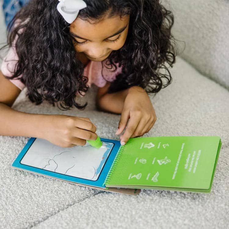 - Reusable pages are white with simple line drawings when dry; reveal colors and patterns when wet