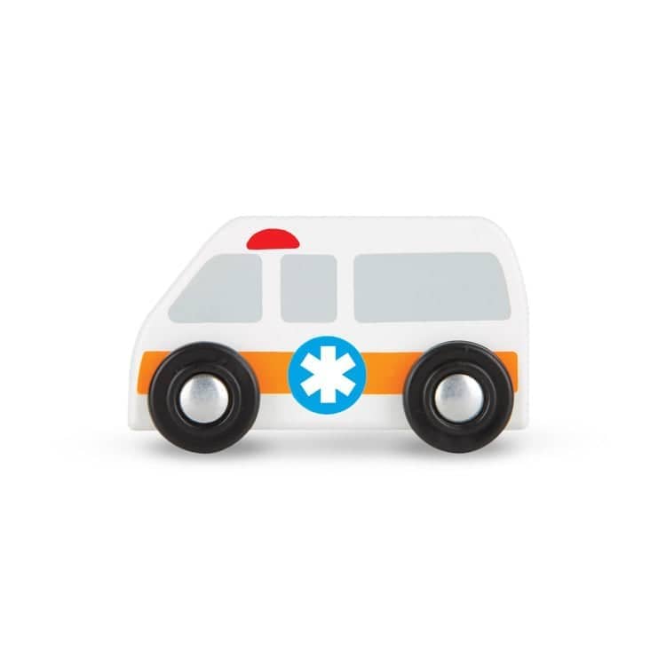 • Includes 4 colorful wooden rescue vehicles: ambulance, fire truck, helicopter, and police car