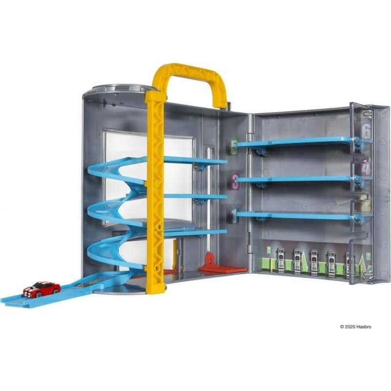 Take the moving elevator to the top floor and race down the spiral ramp to exit the multi-level garage in a hurry. Close up the garage and carry over 45 of your favorite Micro Machines on the go.