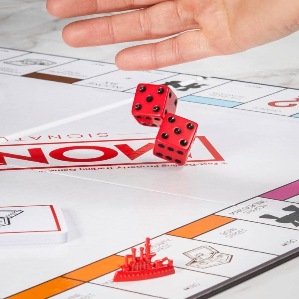 Chase your fortune with this ready-to-display Monopoly Signature Collection board game! Roll the red dice to purchase properties, and raise rent with luxe Houses and Hotels. Players can arrange the foil-treated money in their own personal tray and move around the board with one of 8 red enamel Monopoly tokens. Chance and Community Chest cards may lead players down the path to bankruptcy so don’t get too comfortable! Accumulate wealth, test friendships, and create lifelong memories for generations to come. With classic Monopoly gameplay in a premium package, this collector’s edition of the Monopoly game makes a perfect gift for Monopoly fans ages 8 and up. The Hasbro Gaming and Monopoly names and logos, the distinctive design of the gameboard, the four corner squares, the Mr. Monopoly name and character, as well as each of the distinctive elements of the board and playing pieces are trademarks of Hasbro.