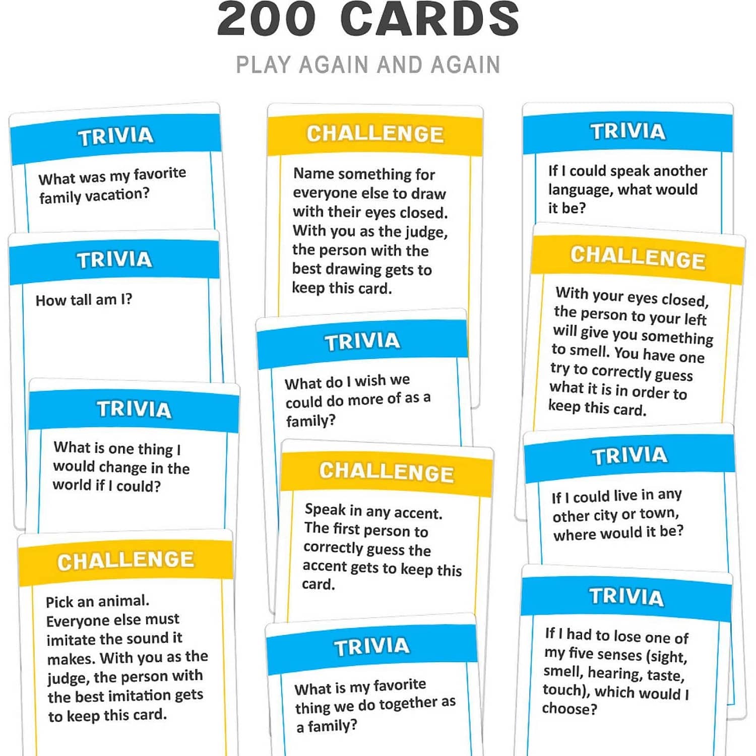 So easy to learn and play, ‘Do You Really Know Your Family ‘ contains 2 sets of playing cards – Trivia and Challenge. Draw a Trivia Card and read the question about yourself out loud. The first person to guess the answer you are thinking of wins the card! Challenge Cards have silly and fun challenges and games for the family to perform together. Complete the challenge and score another card! Share the laughs as you all learn things about each other that you never knew! It’s wholesome fun for everyone. ‘Do You Really Know Your Family ‘ is an ideal game for family game night as well as making a great party game. With 200 different cards in the box, there’s plenty to learn about everybody and heaps of silly challenges to perform. Great for 3 to 8 players.