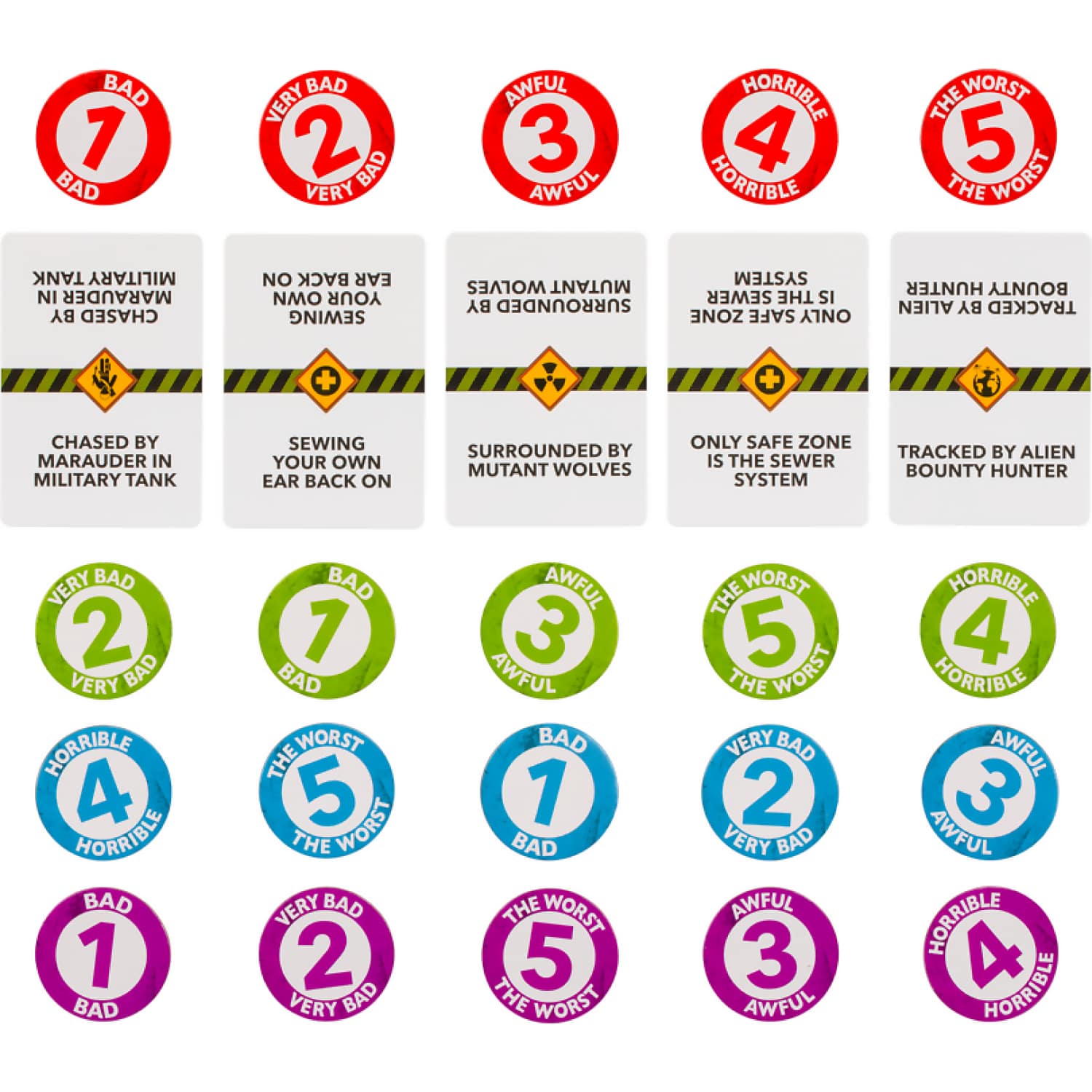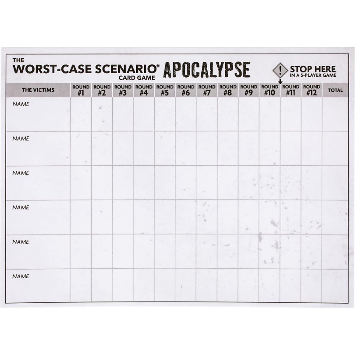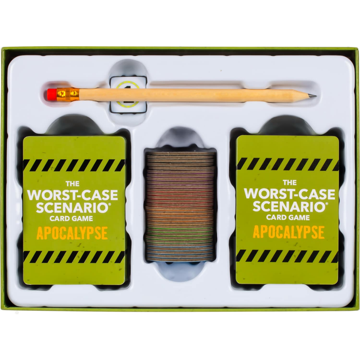 Based on the New York Times Bestseller, The Worst-Case Scenario Card Game APOCALYPSE has very easy rules, but difficult choices. It’s a fun easy-to-play adult game for ages 14 to adult for 3 to 6 players. Components include 225 APOCALYPSE Scenario Cards, The Victim Die, 30 Ranking Chips, Score Pad, Pencil, and Easy Rules.