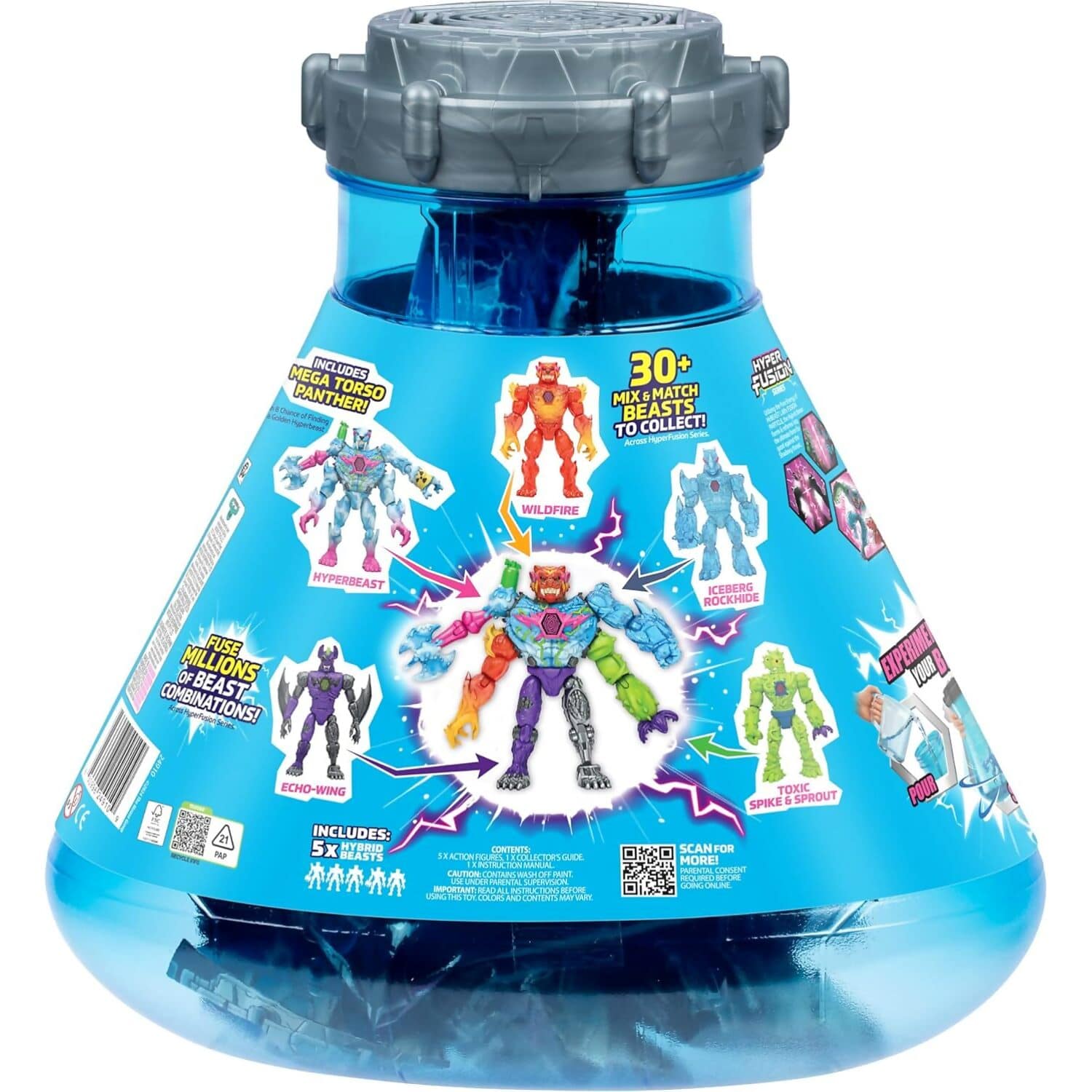 The experiment begins with the MrBeast Lab vessel – twist and crack open the lid to reveal a massive strip of 13 sealed foil bags. Rip them open to uncover individual beast parts to create five 4 inches (10.16 cm) tall epic action figures, including the Mega Torso Panther. Place the Super Hybrid figure into the vessel and adding water. Pour, swirl and reveal your Hybrid’s true color.