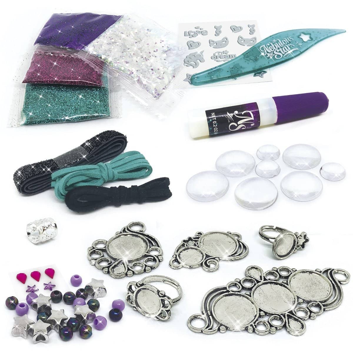 Create 5 shiny cosmic jewelry with a variety of glitter powder and rub-on transfers.