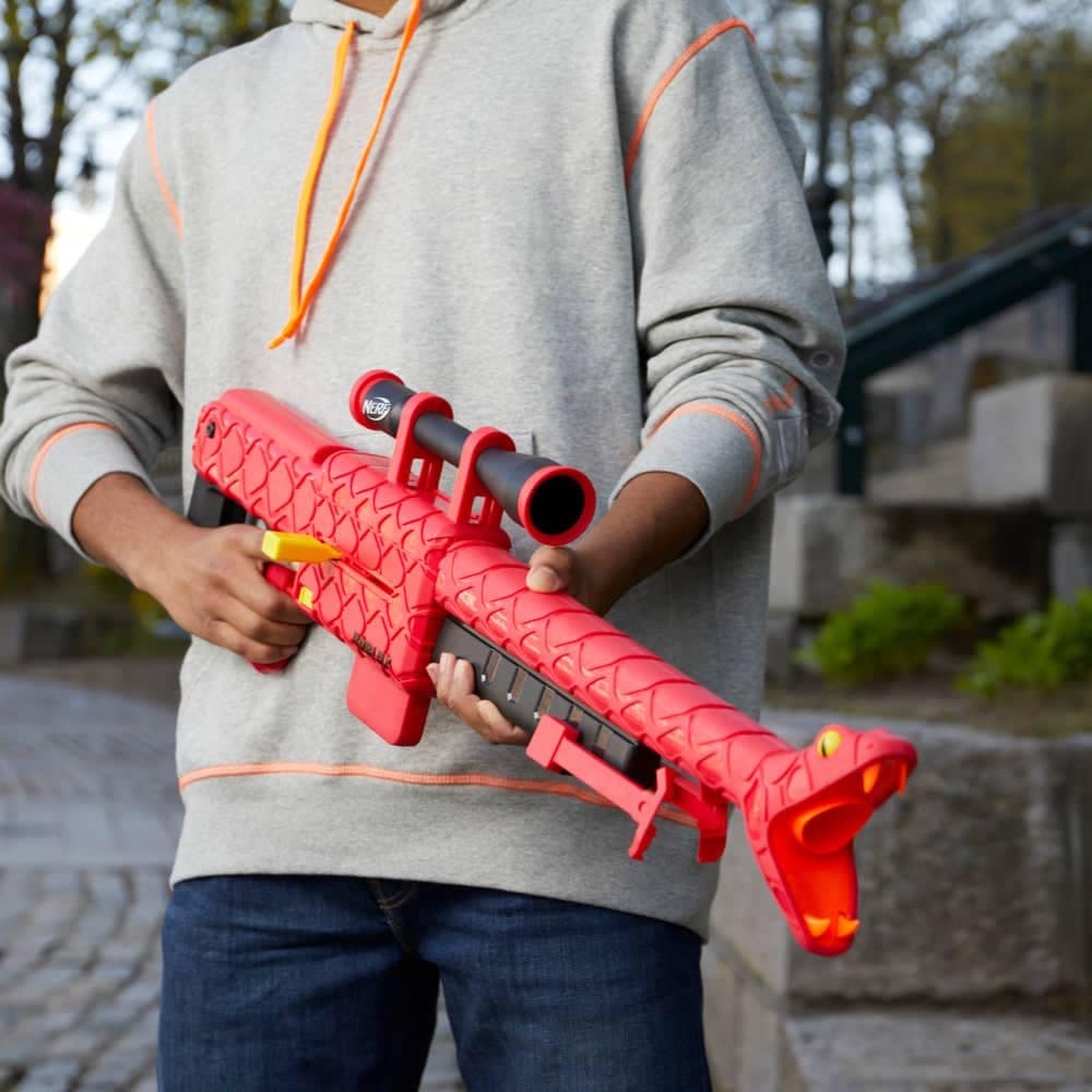This Nerf Roblox Zombie Attack: Viper Strike dart-firing blaster takes its inspiration from the Roblox experience Zombie Attack by wenlocktoad vs indra! The blaster includes a special code that allows you to redeem an exclusive virtual item on Roblox!* Sink your fangs into dart-blasting fun with this blaster that features a cool snake design. It includes a removable 6-dart clip and 6 Nerf Elite foam darts and has bolt-action priming.
