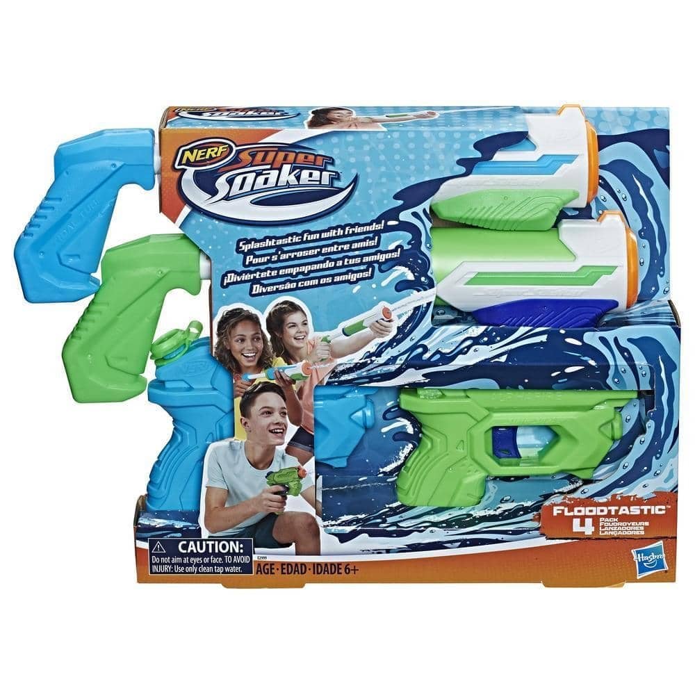 For splashtastic fun with friends, bring along the Super Soaker Floodtastic 4-Pack! The pack includes 2 Tidal Tube water blasters and 2 AlphaFire water blasters. Fill them with water and get together with friends and family for waves of soaking fun. It’s a Super Soaker battle-for-4 in a box! Open the pack, fill the blasters, and let the drenching begin! Each Tidal Tube blaster holds up to 10 fluid ounces (295 milliliters); each AlphaFire blaster holds up to 7.4 fluid ounces (218 milliliters). Pump the handle back and forth to unleash water from the Tidal Tube blasters; pull the trigger to send a stream of water from the AlphaFire blasters. Battlers can pair off in teams of 2 or go solo, but either way, it’s a Floodtastic 4-Pack of fun! Copyright Larami Ltd. Nerf Super Soaker and all related properties are trademarks of Hasbro.