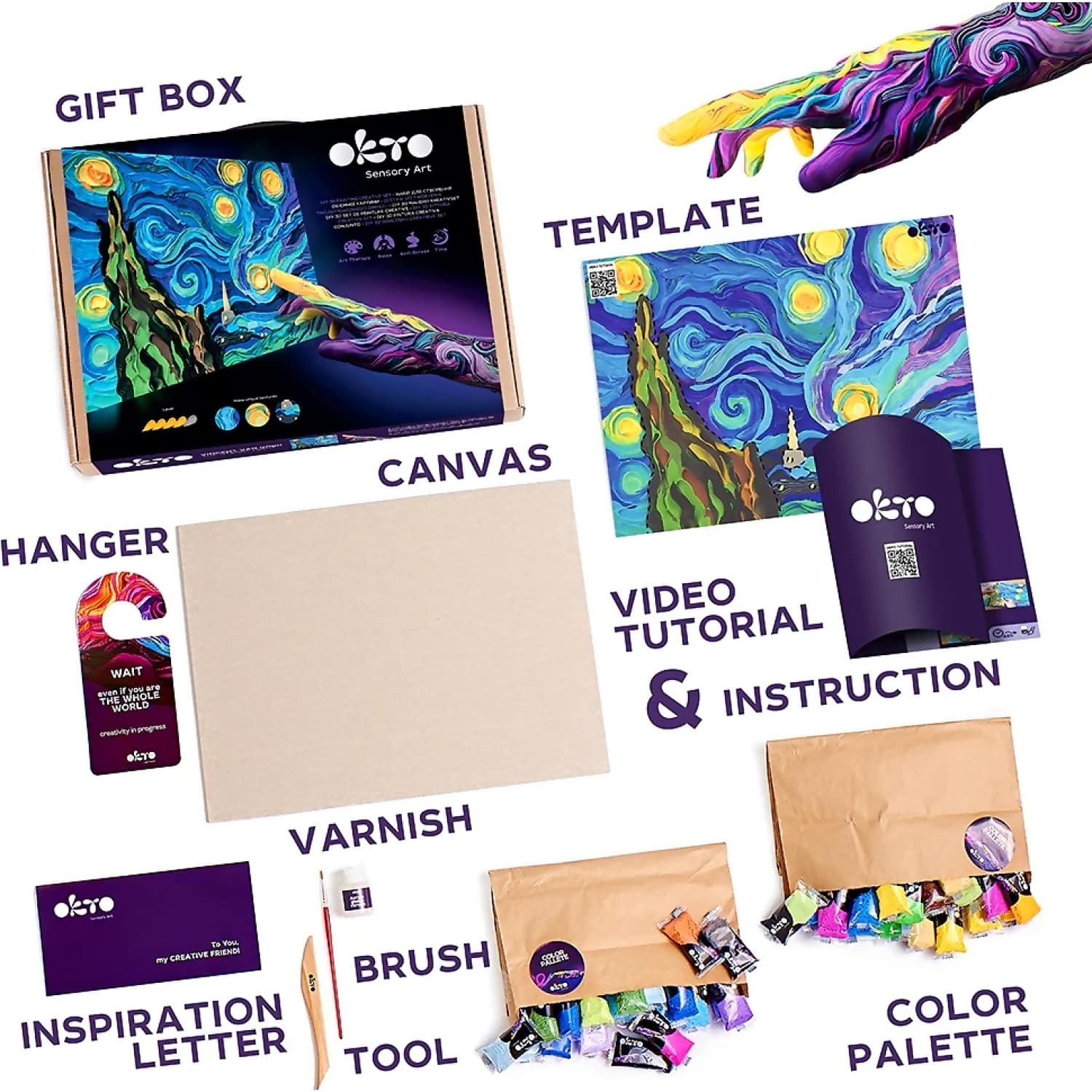 Immerse yourself in a calming, tactile experience with the OKTO Sensory Art – Creative Set Starry Night. Designed for self-expression and mindfulness, this set invites users to trace celestial swirls and create a textured masterpiece inspired by Van Gogh’s iconic night sky. The soft, mess-free clay glides effortlessly onto the canvas, allowing colours to blend and shapes to form with ease.