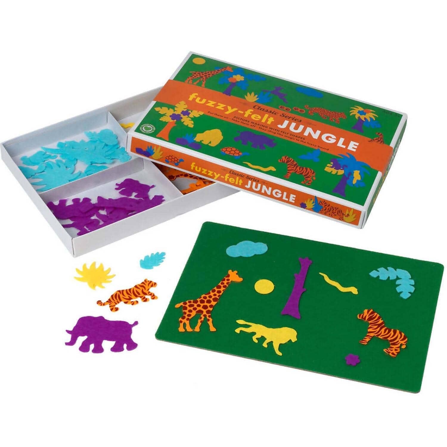 Unleash your child’s creativity and embark on a wild adventure with the Fuzzy Felt Classic Jungle set! This beloved classic toy has been delighting children and sparking their imaginations for generations, and now it’s back with an exciting jungle twist. Inside the box, you’ll discover two sturdy fuzzy boards, each brimming with vibrant and detailed scenes of jungle life.