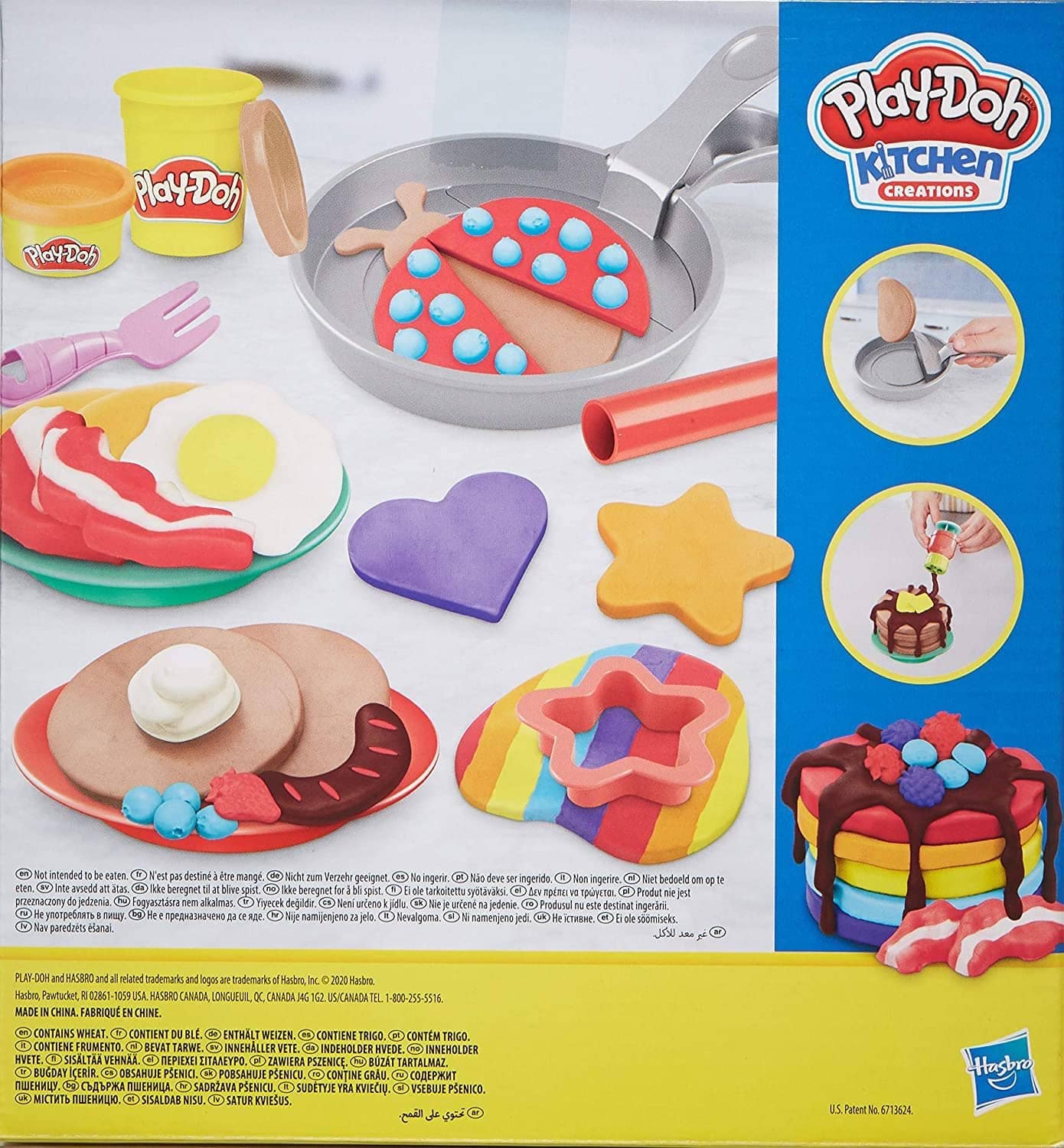 FLIP ‘N FUN FRYING PAN TOY This PlayDoh breakfast toy for kids 3 years and up lets you make and flip PlayDoh pancakes with the button on the toy skillet