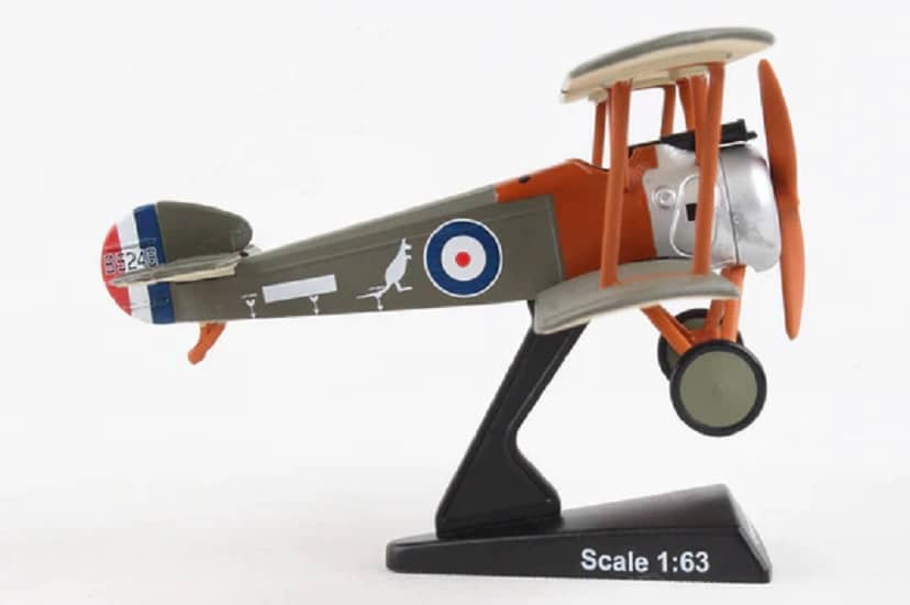 The Australian Flying Corps (AFC) was established in 1912 and was the forerunner of the Royal Australian Air Force (RAAF) which was formed on 31st March 1921. The AFC’s No 1 Squadron flew against Turkey in the Middle East from 1915 to 1918 and no’s 2,3 & 4 Squadrons against Germany on the Western Front from 1916 till the Armistice in 1918. The AFC’s best fighter aircraft in the final stages of WW l was the famous Sopwith Camel which could climb to 3000 meters (12,000 feet) in 12 minutes, fully loaded with weapons and ammunition. The Sopwith Camel was a single-seat biplane fighter aircraft that was introduced to the Western Front in 1917. The Sopwith Camel was powered by a single rotary engine and armed with twin synchronized Vickers machine guns. The AFC’s 3 top Aces A. H. Cobby, E. R. King and E. J. McCloughry all flew Sopwith Camels in No.4 Sqn. AFC. This diecast metal airplane model comes in 1:63 scale with plastic stand and is approximately 3 3/4 inches long with 5 1/4 inch wingspan.