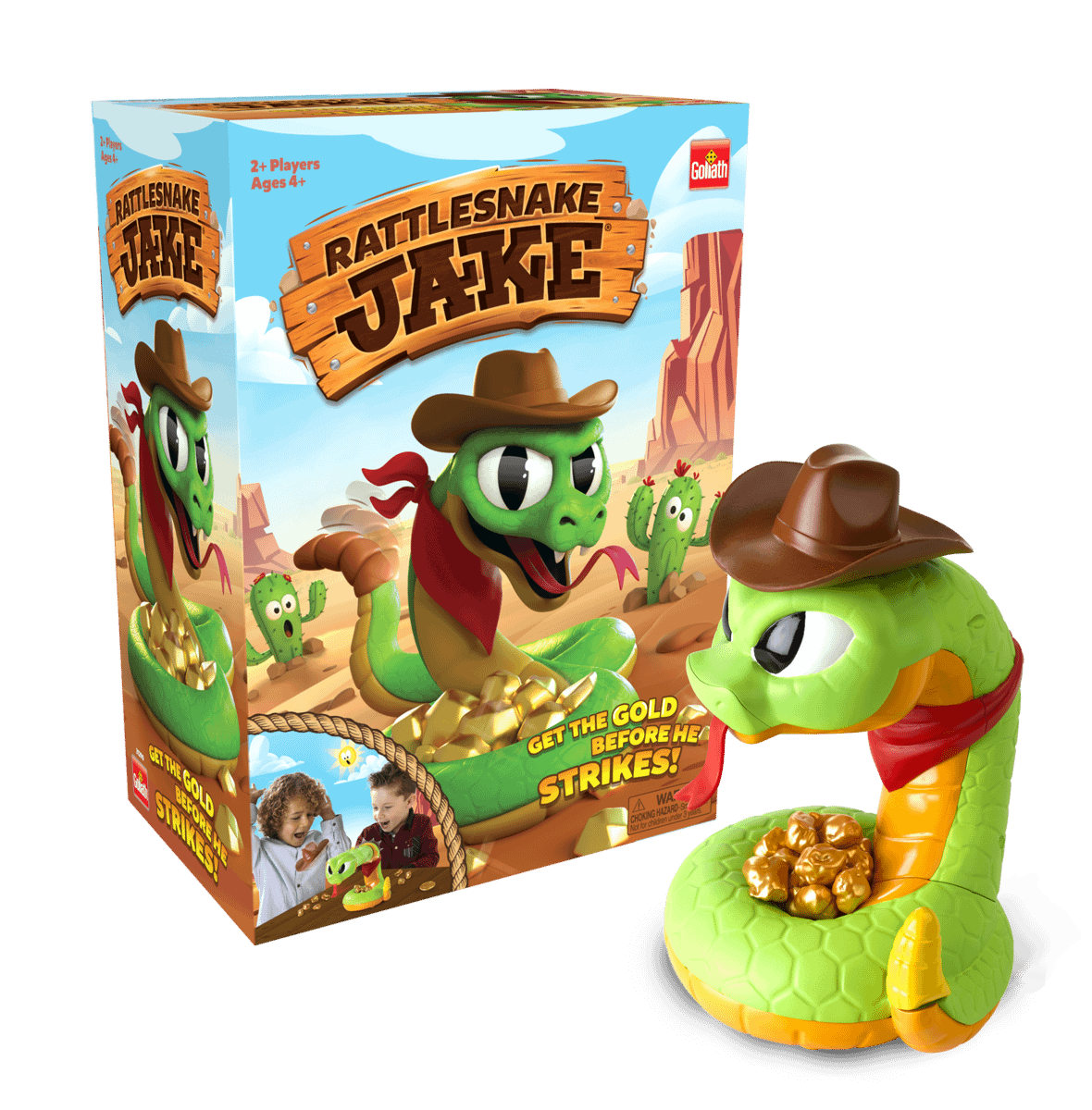 Rattlesnake Jake has stolen your gold! Watch out for his rattle, and carefully sneak the gold back. One wrong move and he strikes! His ominous rattle builds the suspense for the ultimate jump! If Rattlesnake Jake strikes on your turn, you must return half of your nuggets to him. The player with the most gold when the last nugget has been taken wins the game. Requires 3 AAA batteries, not included.