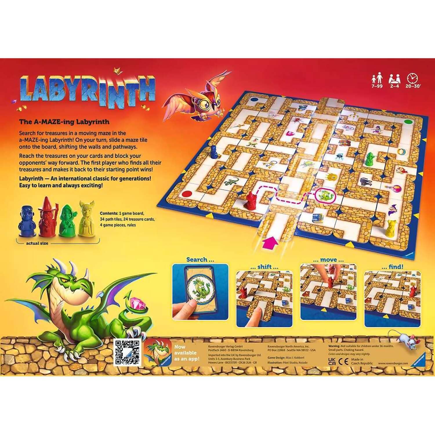This item includes 1x Game board, 34x Maze cards, 24x Treasure cards, 4x playing pieces & Instructions. This game is suitable for 2-4 players. Suitable for ages 7 years and up.