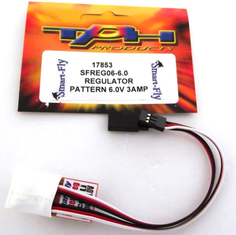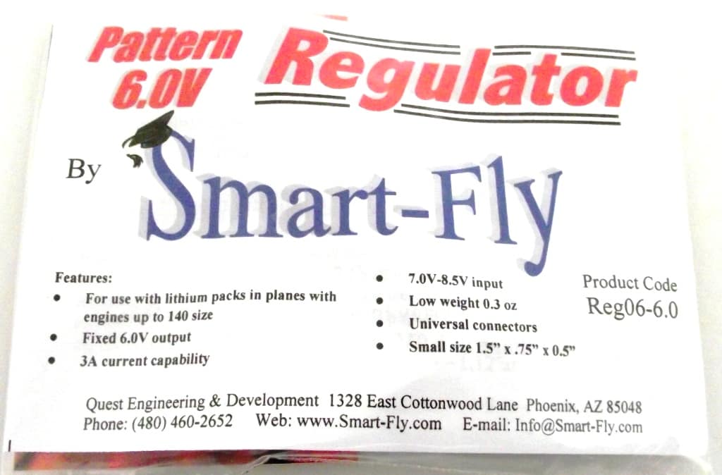 The Pattern Regulator is designed for a 2 meter pattern plane orsmaller. Do not use this for 3D flying. The Pattern Regulator has afixed 6.0V output and has a current capability of 3A continuous. Theregulator has a large output capacitor to handle the peak currentsrequired by an electronic ignition. The regulator has universalconnectors with 22-gauge wire.