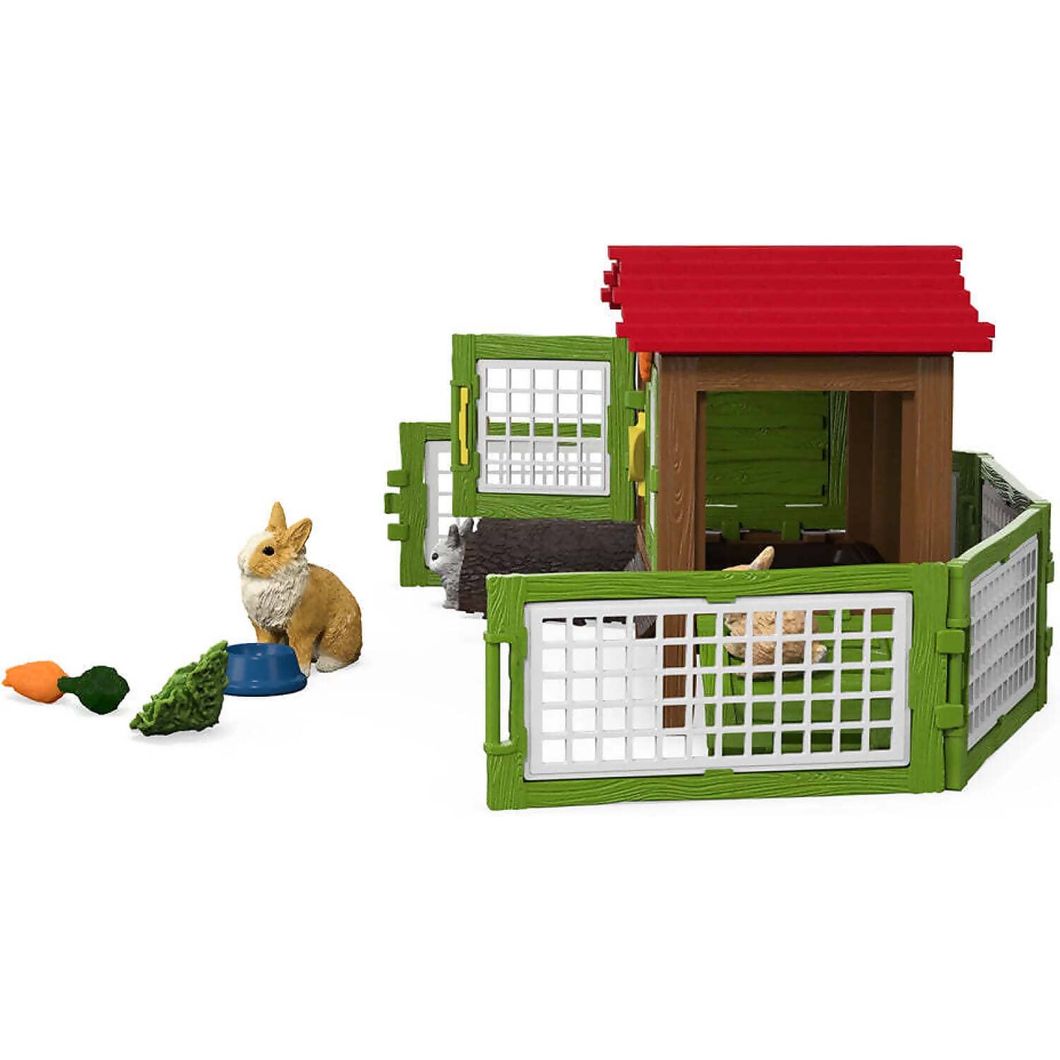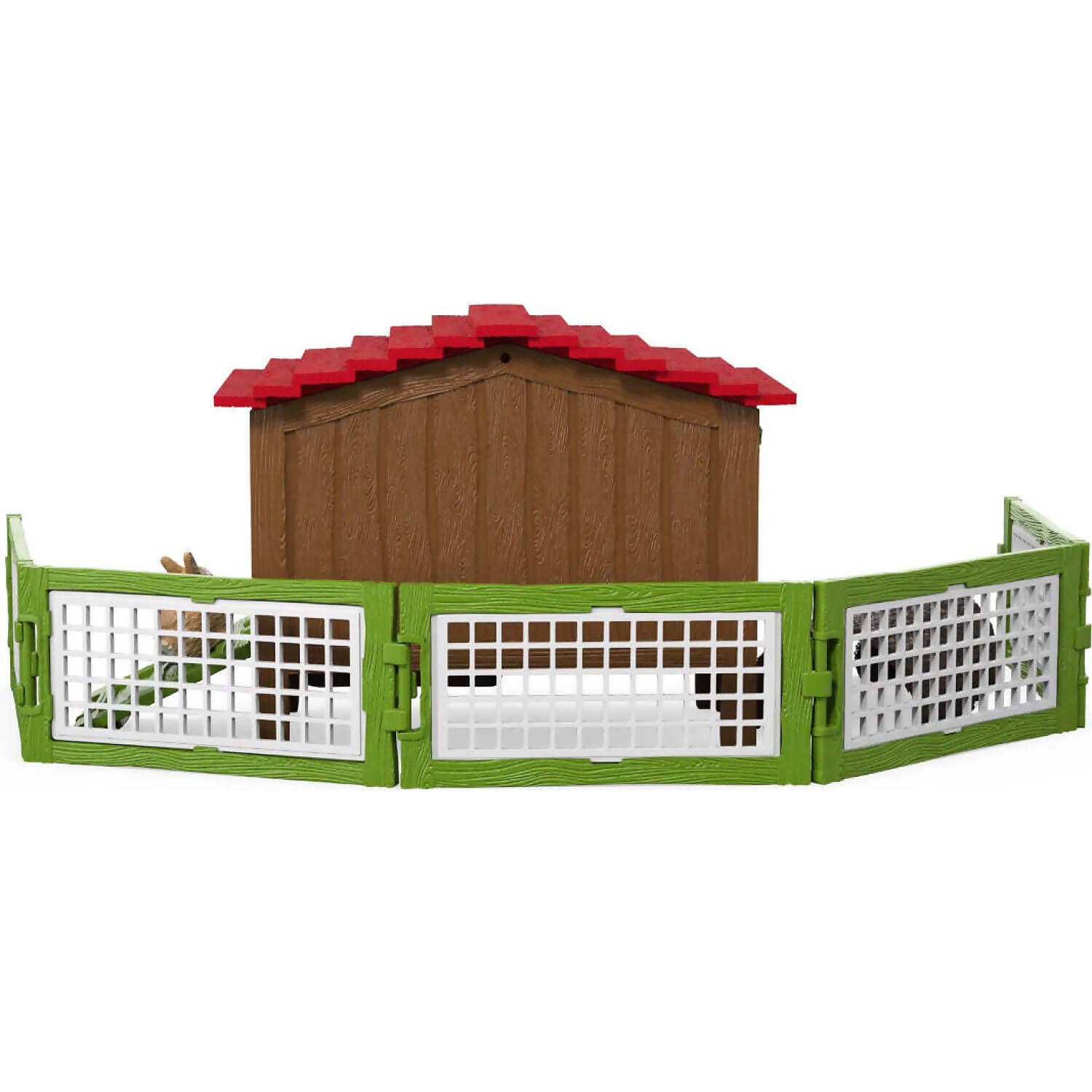 1x rabbit hutch, 5x fencing element, 1x lionhead rabbit, 2x baby rabbits, 1x lettuce, 1x carrots, 1x bowl, 1x straw, 2x crawl tunnel