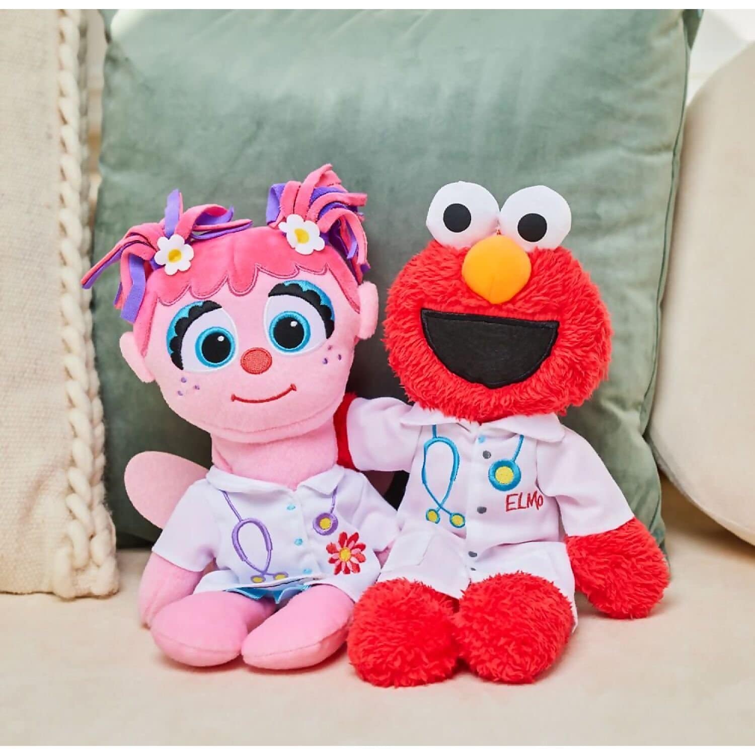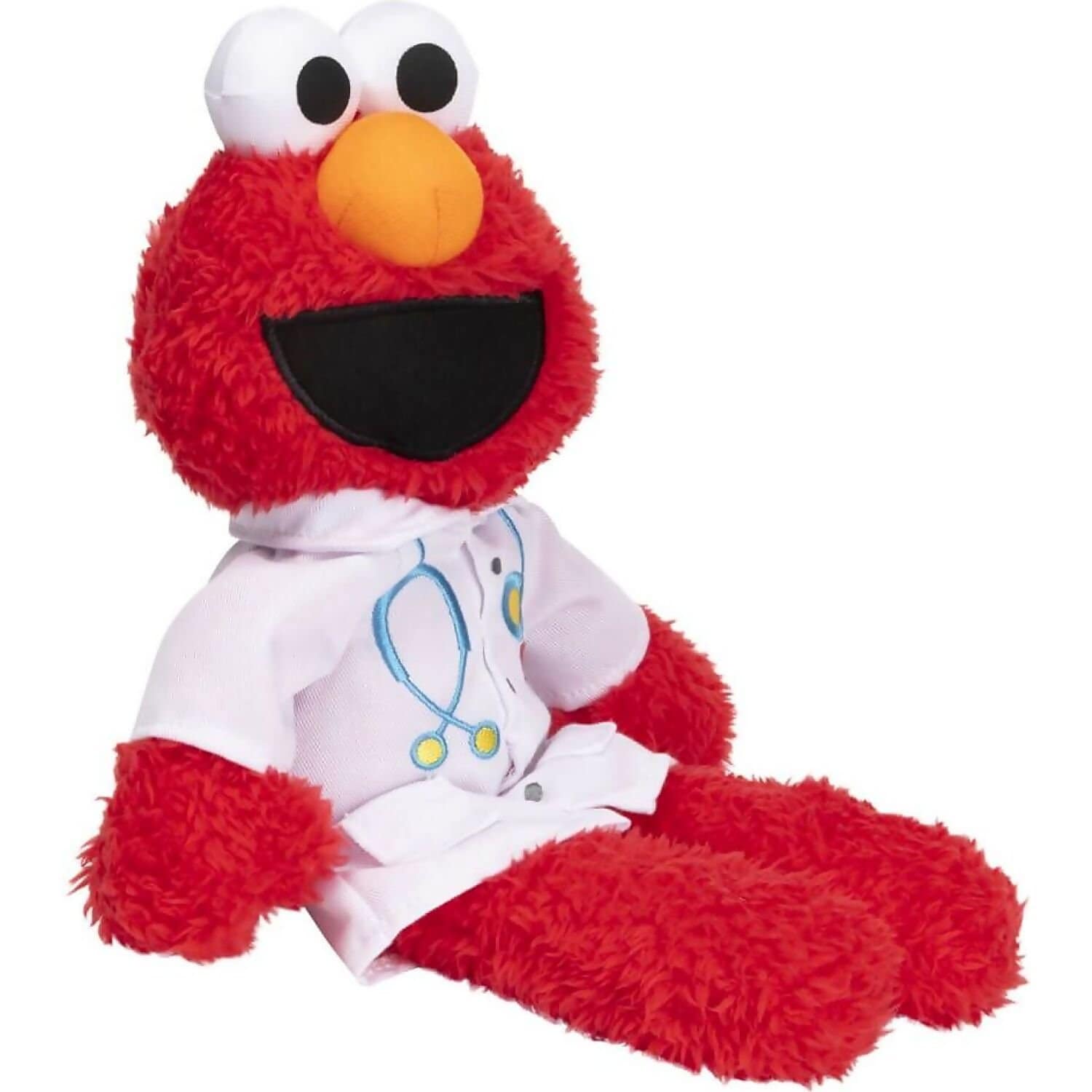 - Elmo wears a white lab coat with a stethoscope & ‘Dr. Elmo’ embroidery