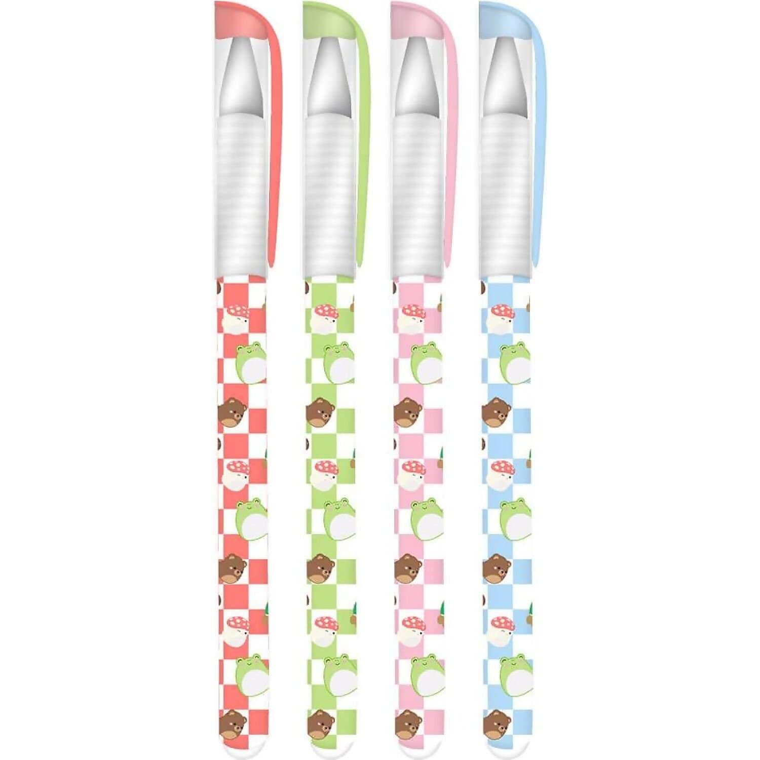 Presented in a clear wallet decorated with popular Squishmallows characters Wendy Frog and Sawyer Squirrel, this set includes 4 different gel pens.