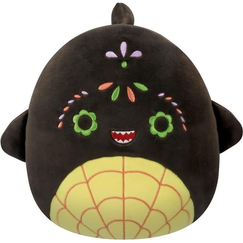 Dive into spooky season with Oceana the Shark, a bold and vibrant member of the Squishmallows Halloween Day of the Dead collection. This 8-inch plush features a dark brown body with a bright yellow shell-like belly, embroidered floral eye accents, and a stitched toothy grin that adds a playful twist to her festive look. Inspired by Día de los Muertos traditions, Oceana blends underwater charm with cultural celebration for a truly unique plush experience.