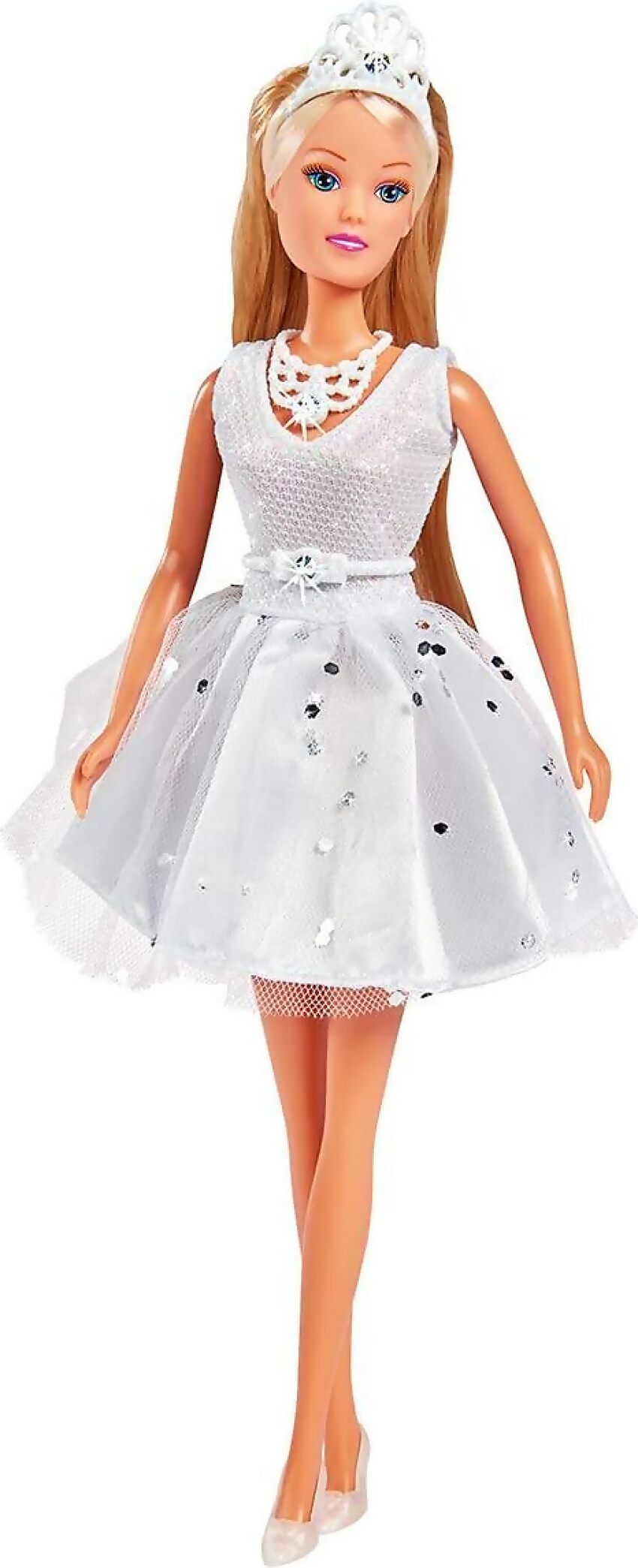 The Steffi Love Crystal Deluxe version takes this to another level. She has long blonde hair and comes with a white mini dress. The tulle overskirt of the dress is decorated with numerous glitter elements that sparkle beautifully. The doll’s necklace, belt, and tiara are finished with shiny Swarovski crystals, adding an extra touch of glamour and sophistication.