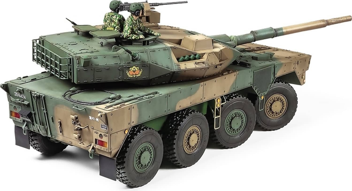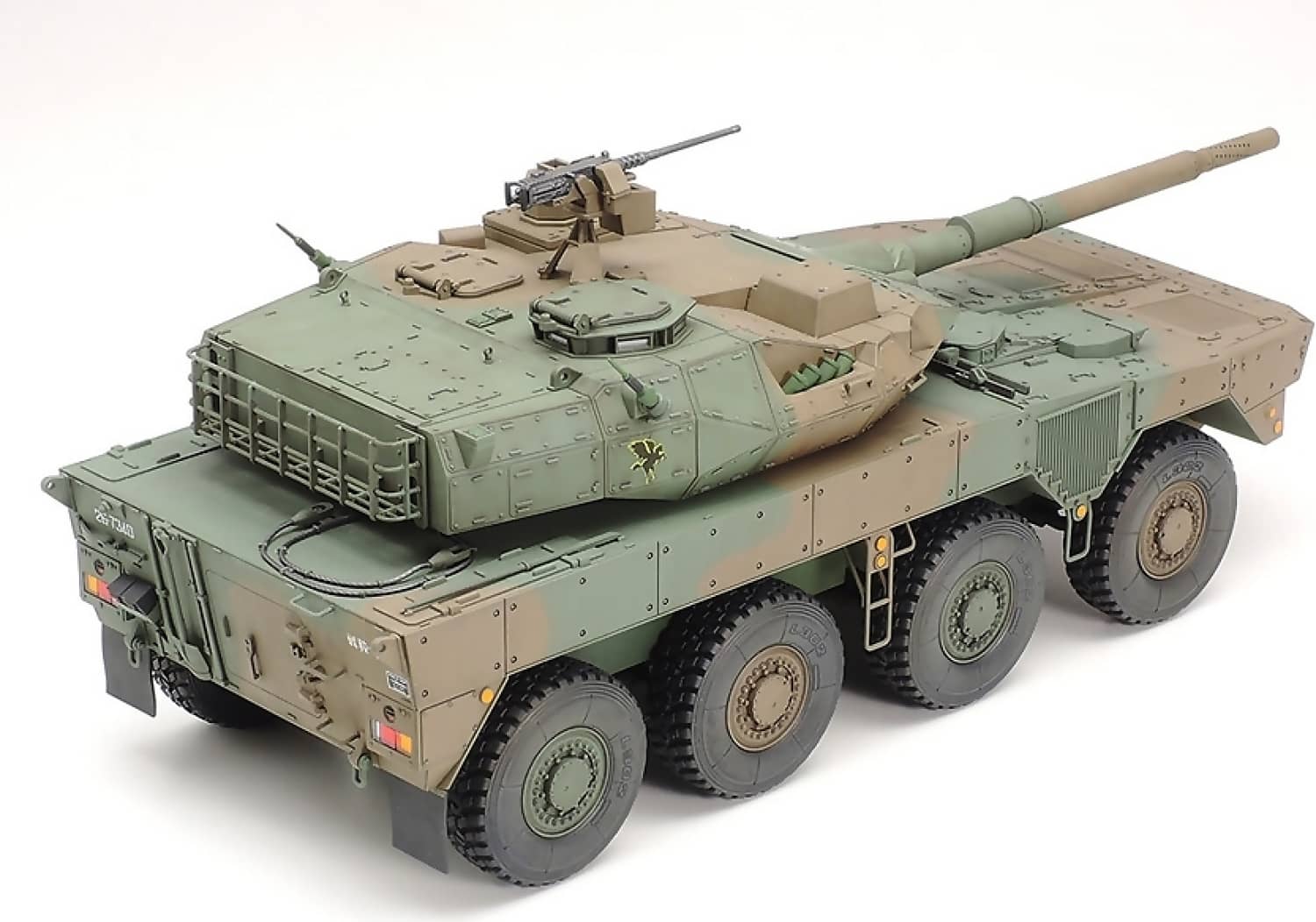 This scale model assembly kit recreates the Japan Ground Self Defense Force (JGSDF) Type 16, which reached units beginning in 2017. An 8-wheel vehicle, the JGSDF classify it as a Maneuver Combat Vehicle (MCV), a highly mobile and well-armed vehicle intended to provide supporting fire and take on enemy armor as a part of rapid response units. Its domestically designed L/52 105mm rifled gun is a low-recoil piece with perforated muzzle brake and a fire control system to enable accurate firing on the move. Rolled steel turret and hull employ modular and spaced armor estimated to be able to survive frontal hits from 20-30mm class guns and portable anti-tank weapons. Thanks to its 570hp engine, the 26-ton Type 16 has a top speed of around 100km/h and significant range; it looks set to provide a major boost to JGSDF units as its rollout continues.