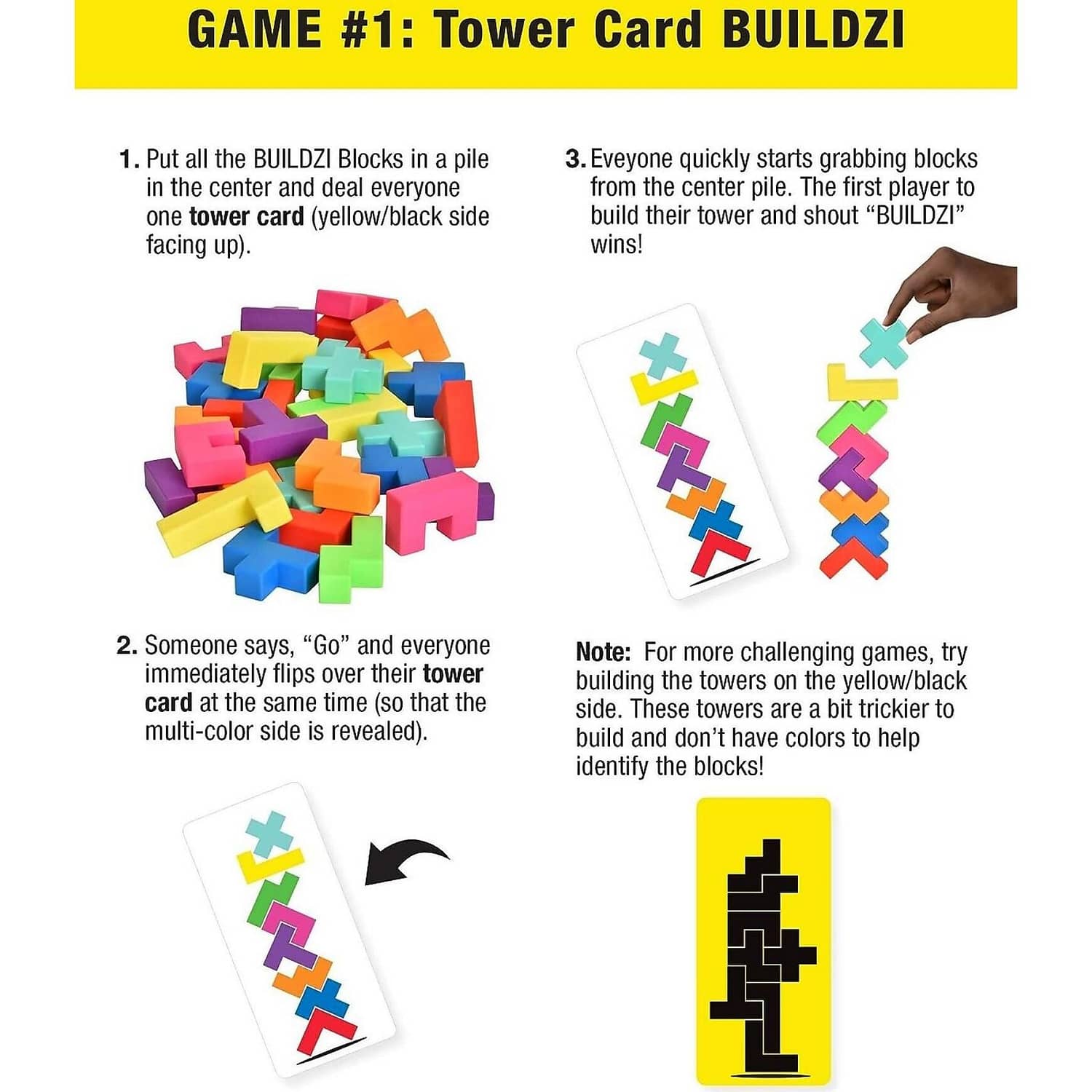 • FAST STACKING: BUILDZI is fun because it’s fast and easy to learn. Flip over your Tower Card or Block Card and be the first to build your block tower. For more of a challenging tower game try using the yellow/black side of the Tower Card, these towers are a bit trickier to build and don’t have colors to help identify the blocks.
