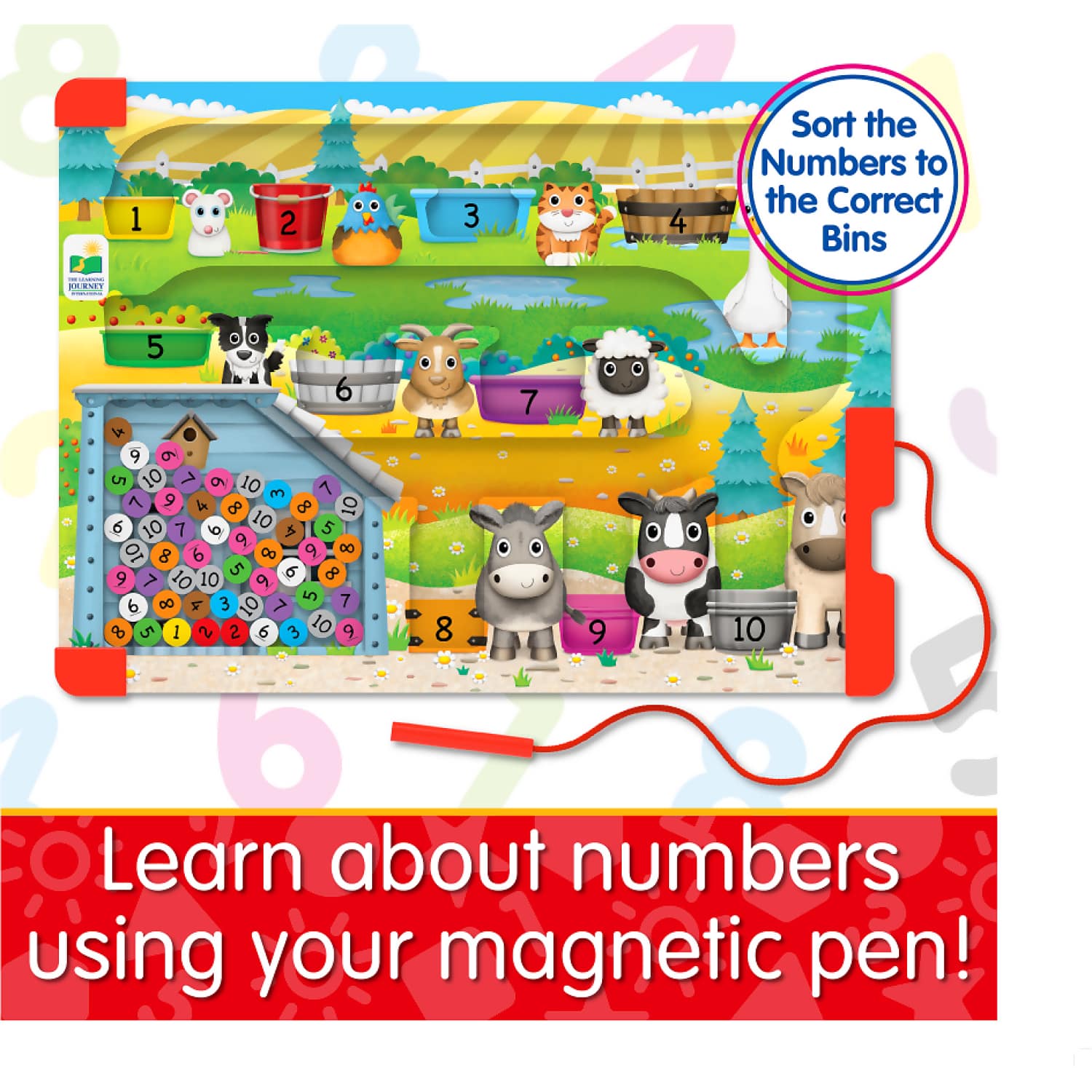 The Learning Journey – Sort & Learn Magnetic Puzzle Counting is a bright and engaging farm-themed tray puzzle designed to introduce children to early counting skills. Using the magnetic pen, children guide each numbered piece into its matching bin, reinforcing number recognition from 1 to 10. Once the puzzle is complete, a simple flip reveals a barn-themed collection area where the pieces tumble back, ready for another round of play.