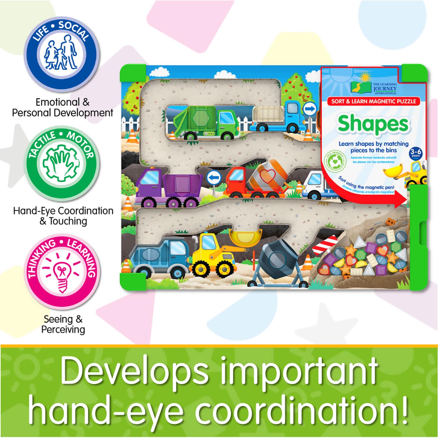 The Learning Journey – Sort & Learn Magnetic Puzzle – Shapes is a vibrant, construction-themed tray puzzle designed to introduce young children to basic shape recognition. Using the included magnetic pen, children guide each shape piece into its corresponding bin, reinforcing visual matching and spatial awareness. Once all pieces are sorted, flipping the tray allows the shapes to tumble into the underground collection area, adding a playful reset to the learning experience.