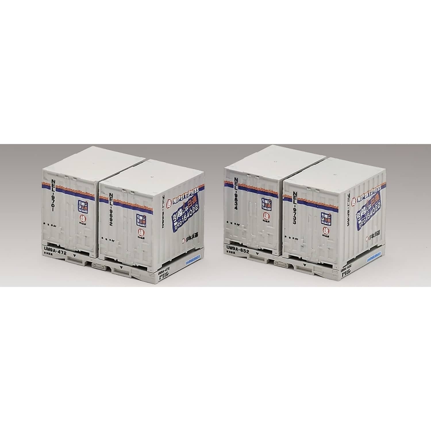 The set includes four NEL containers – NEL-9692, NEL-9701, NEL-9834, and NEL-9733 – and two UM9A frames – UM9A-472 and UM9A-652. Containers and frames are separable, allowing flexible configuration and realistic layout integration. Designed for compatibility with Tomix container wagons, the UM9A frames feature a one-touch mounting system for secure and efficient placement.