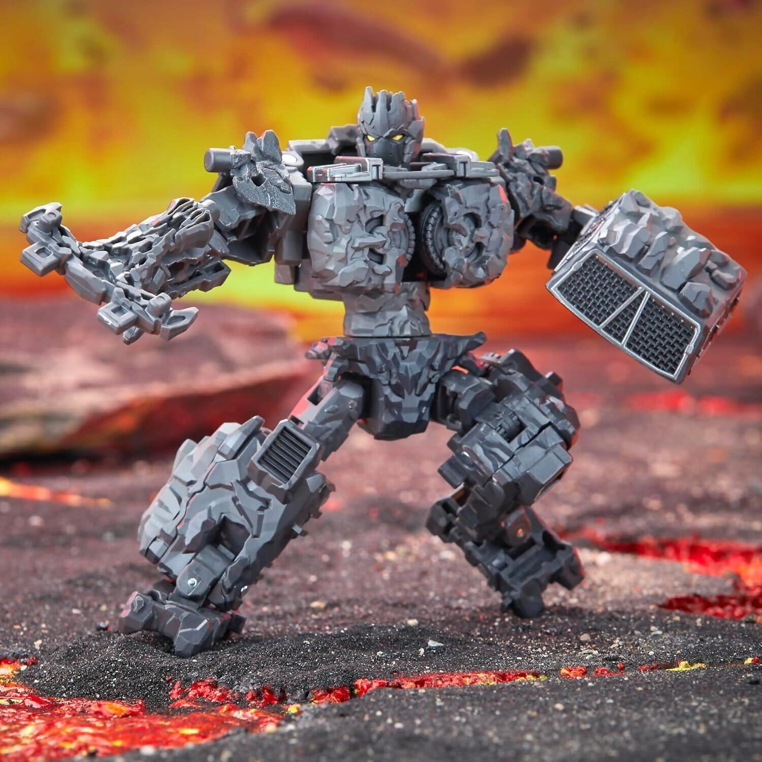 Magneous converts from a rugged rock creature into a powerful offroad vehicle in 10 intuitive steps. As part of the Armorizer class, he can combine with other Transformers robot figures to form rock armour and weapon accessories (each sold separately). Equipped with a rock axe and shield, these accessories attach in both modes to enhance play and display versatility.