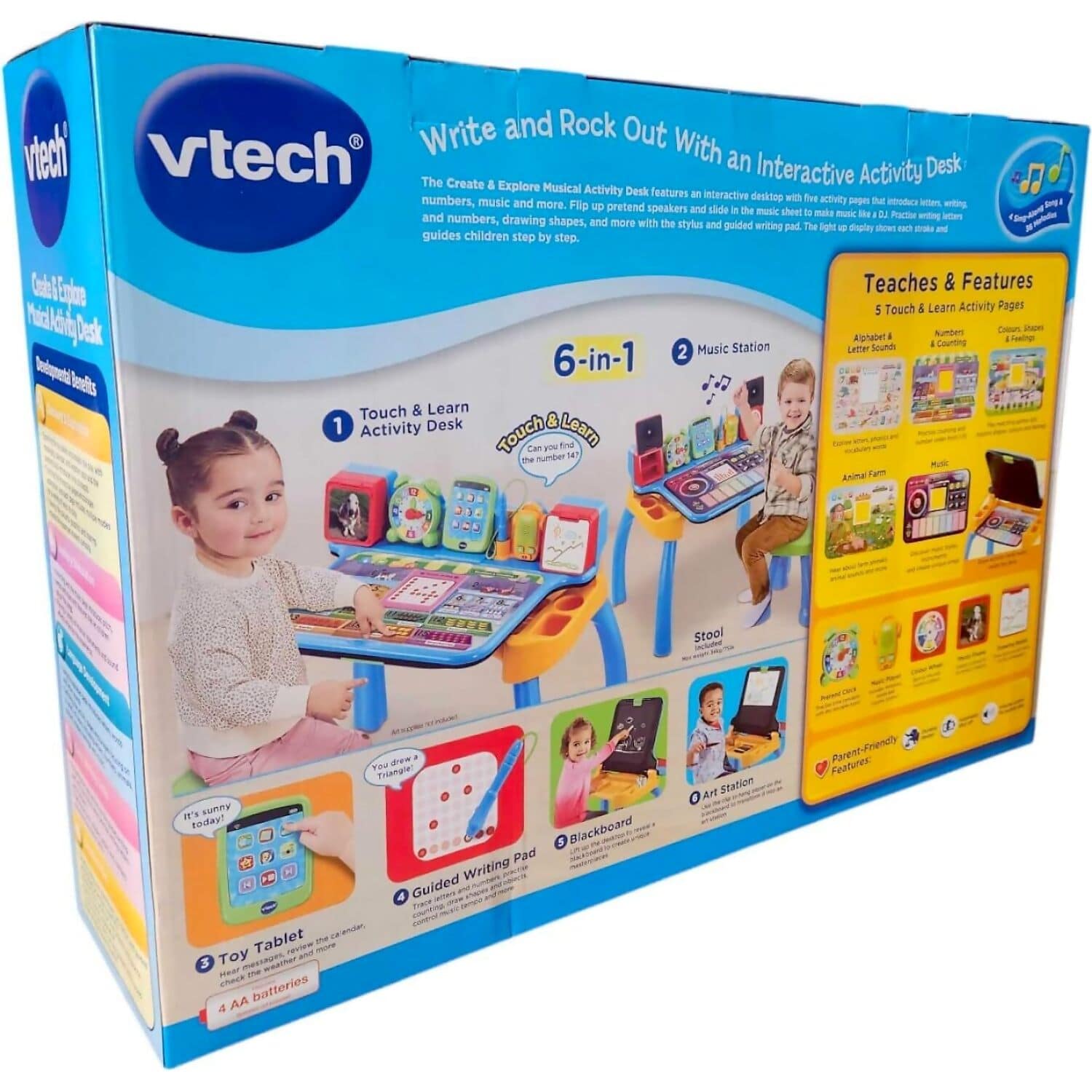 The five Touch & Learn activity pages respond to touch with fun sounds and phrases, encouraging independent discovery and reinforcing key concepts. Children can switch between creative modes, from drawing and writing to musical exploration, all while developing fine motor skills and early literacy. Designed for ages 3 to 6, this desk offers a rich blend of educational content and imaginative play.