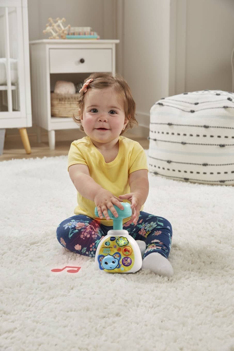 This pretend soap dispenser teaches healthy habits and more in a fun and friendly way. Practise pump-pressing and be rewarded with a mini musical light projection onto your childs hand. The friendly elephant plays fun phrases and sounds at the touch of a button. Press the Music button to hear songs and melodies about handwashing that reinforce hygiene skills. Explore three colours with the Bubbles button. Introduce little ones to early number concepts with the Numbers button that teaches counting with playful sounds and phrases. Hand-washing can be fun! Not a real soap dispenser. Do not put electronics in water.