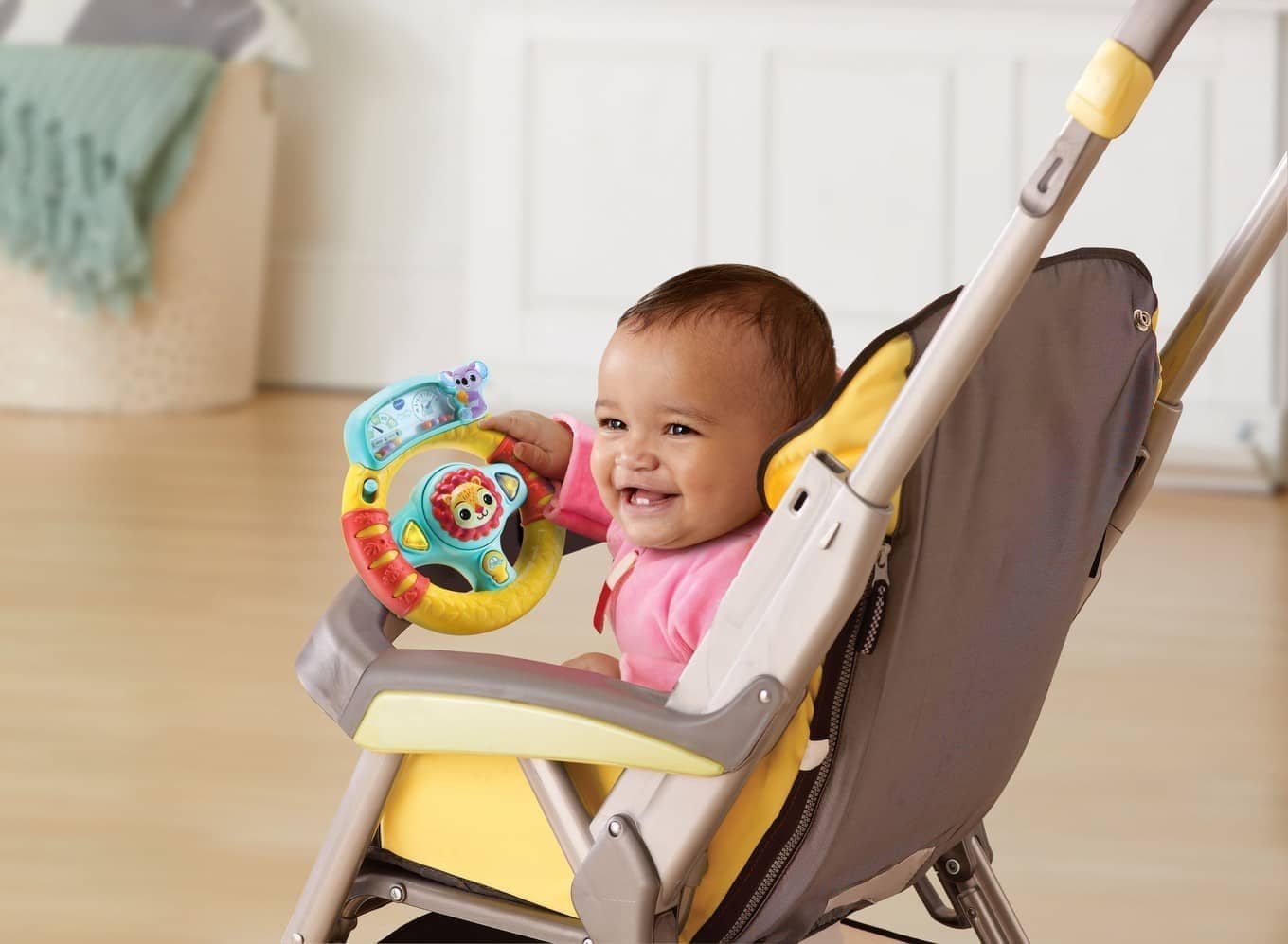 This texture-rich, interactive steering wheel toy lets your baby imagine they are driving with realistic driving sounds, music and imaginative phrases.
