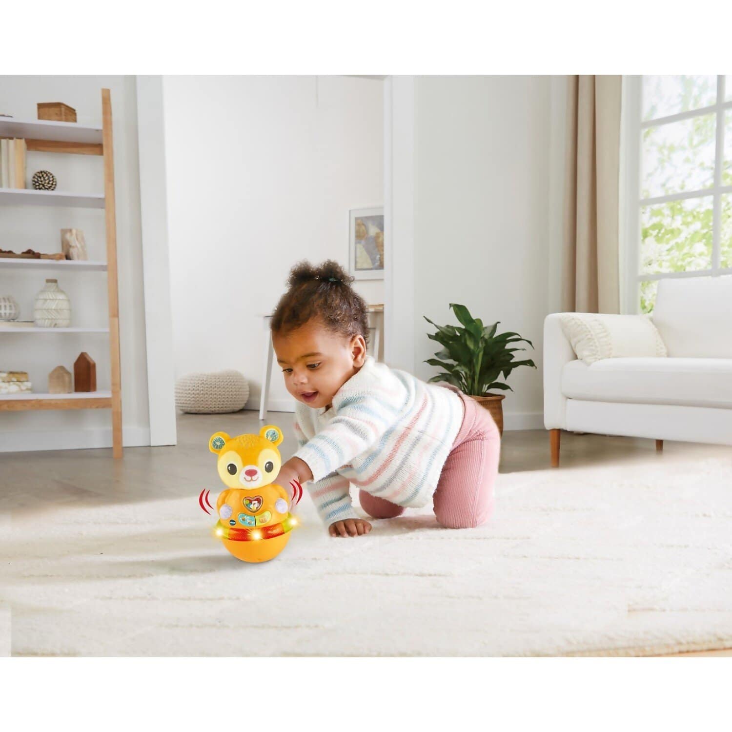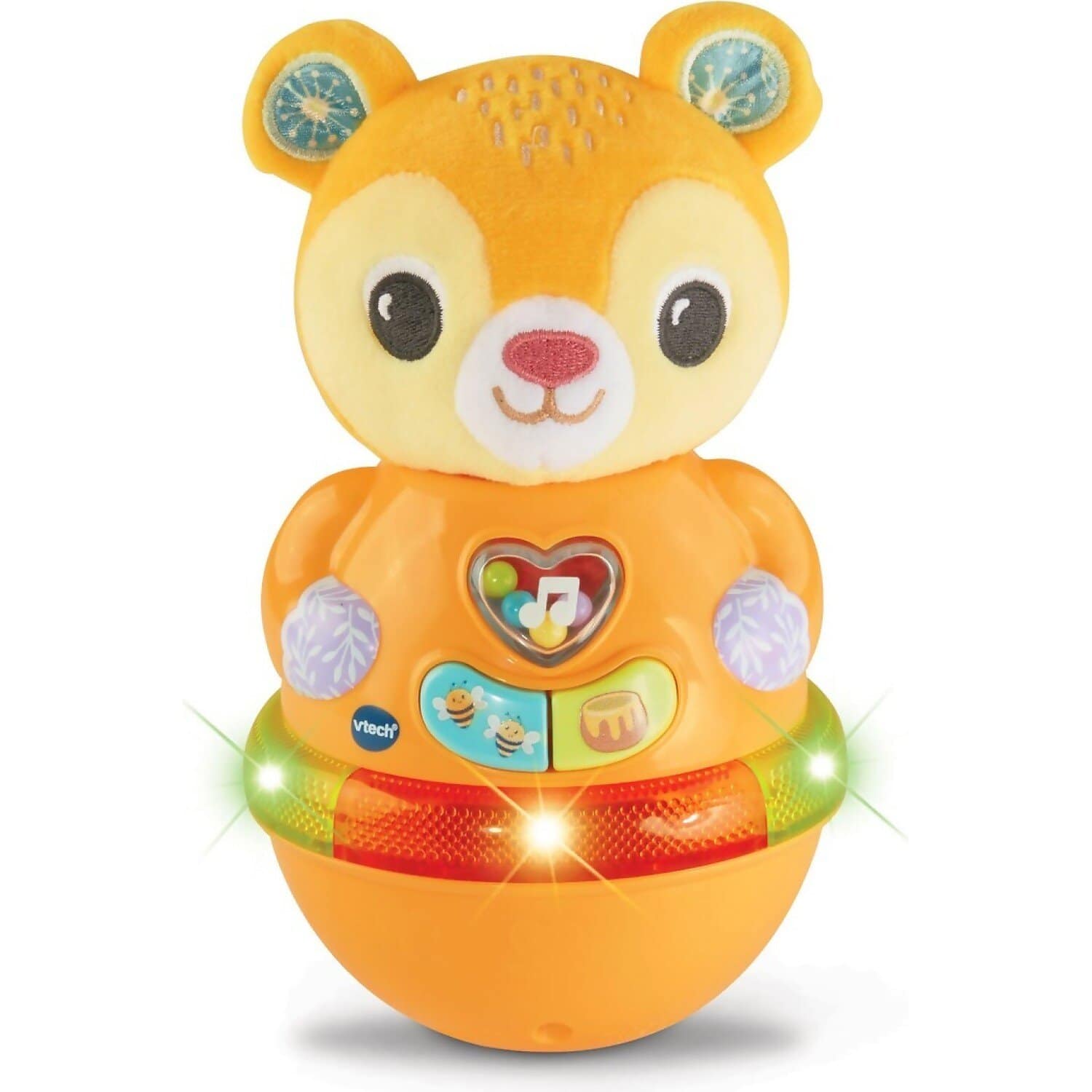 Let’s have some wobbly fun with the Rock and Roll Bear. As bear wobbles back and forth, the motion sensor is triggered so baby can hear fun sounds, which encourage little one to interact with Bear.