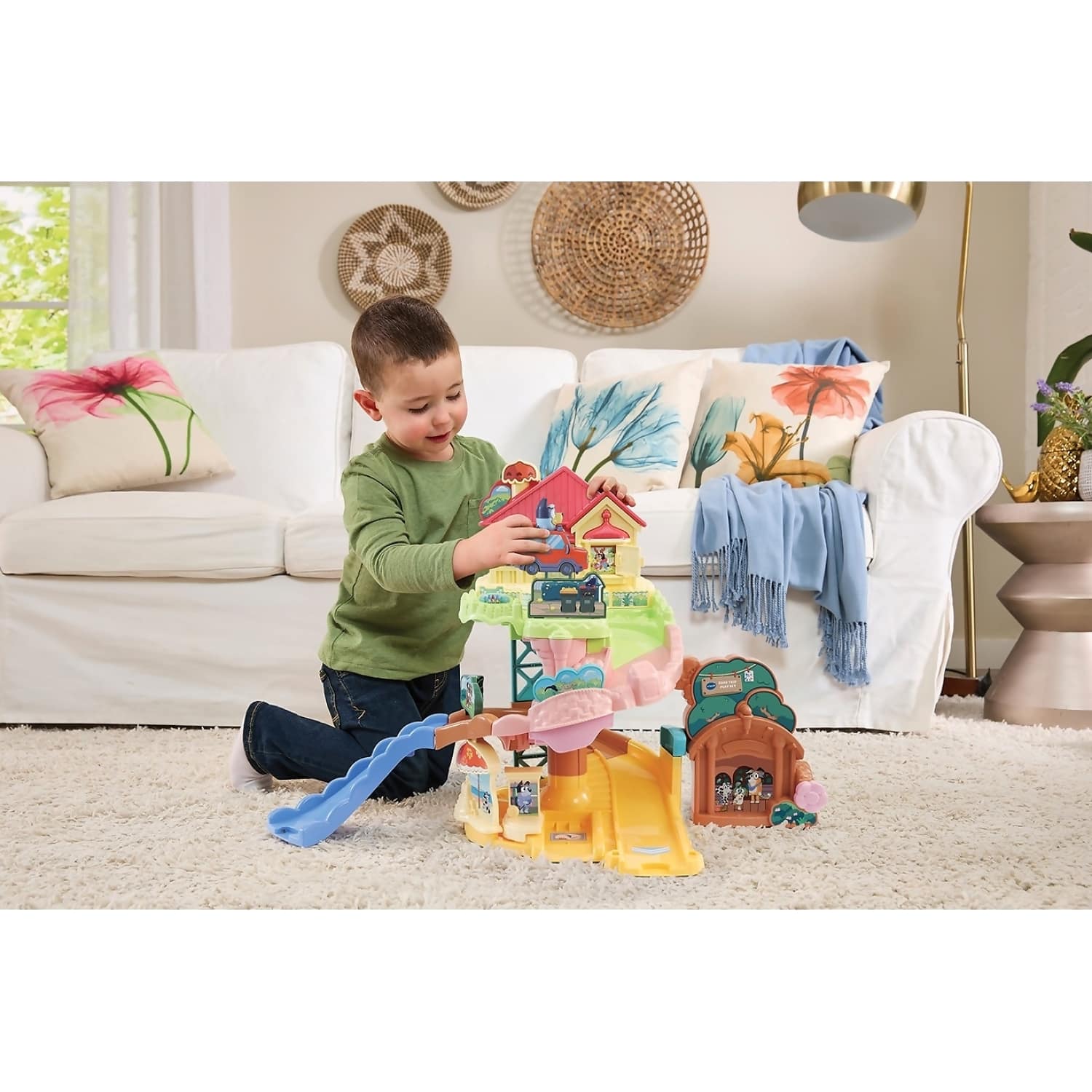 Join Bluey on a fun-filled adventure with the VTech Toot-Toot Drivers Bluey Road Trip Play Set, inspired by the beloved TV show. Drive from the Heeler House to the beach, school and more, zooming past favourite characters and show moments. Press Bluey’s head or drive over four SmartPoint locations to hear her real voice, cheerful phrases, one sing-along song and six melodies.