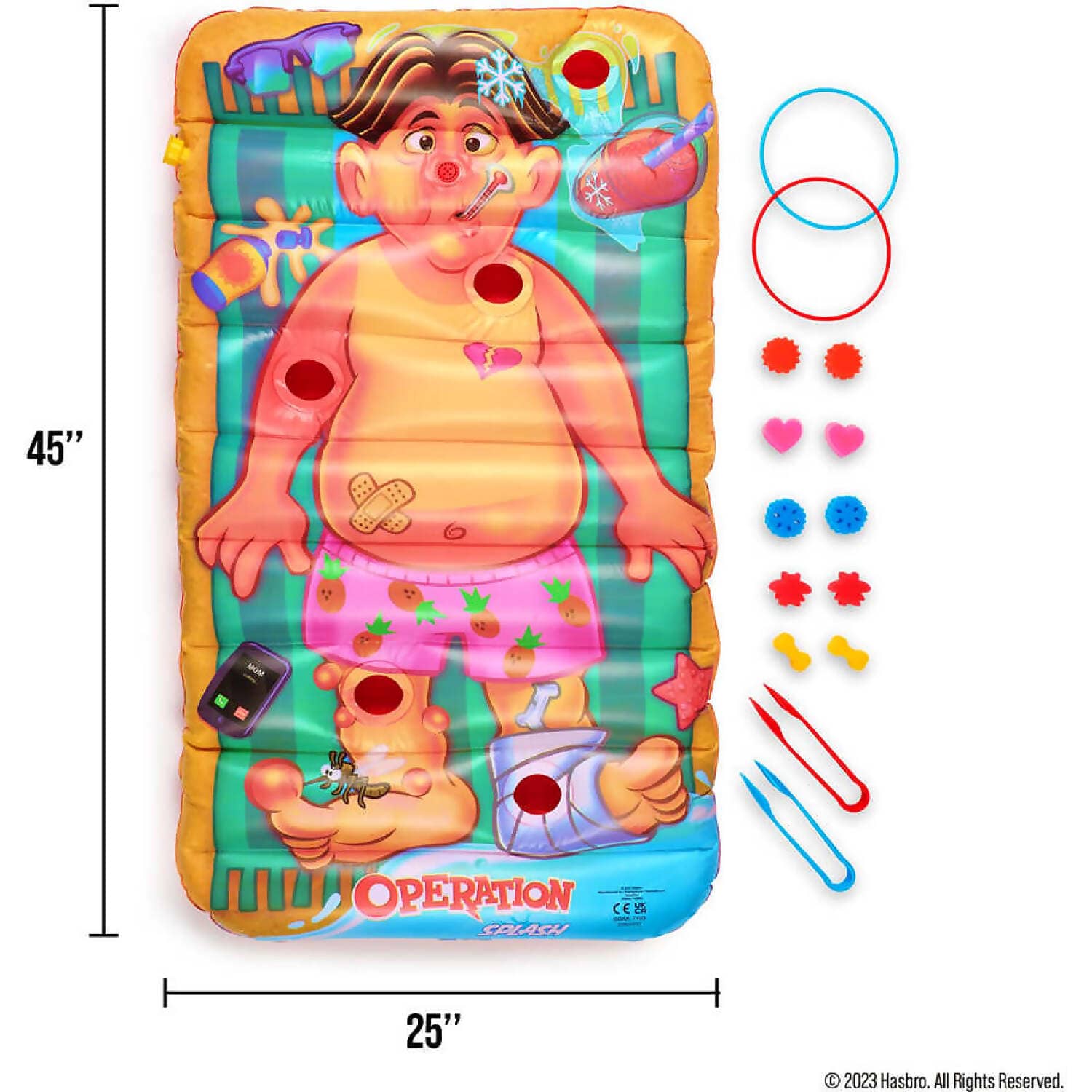 The game includes an inflatable mat, lifesaver rings, tongs, foam ailments, a repair patch, and instructions. It’s designed for children aged 4 and up, with adult supervision recommended.