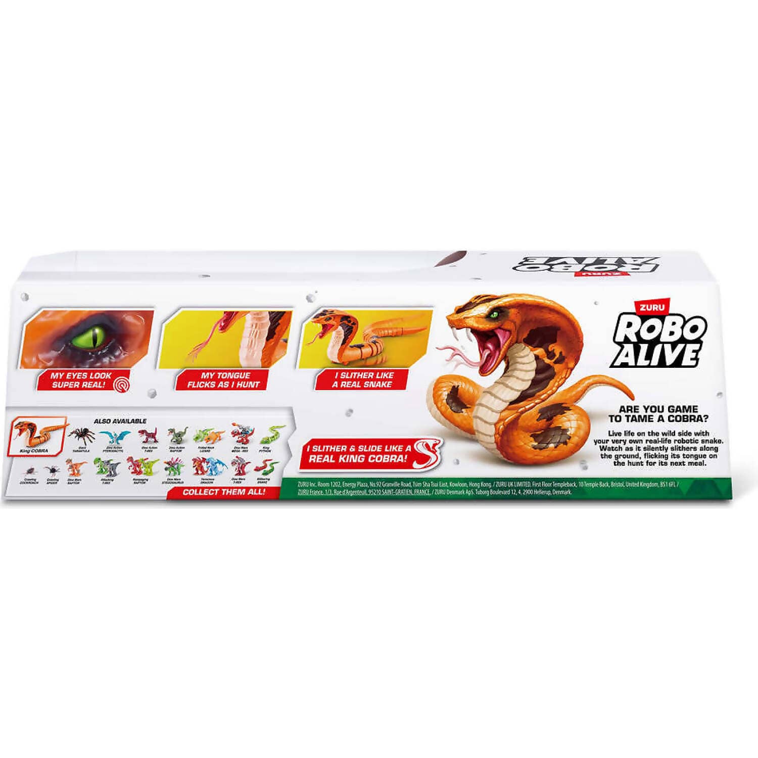 Smart Movement Technology: Robo Alive smart movement technology gives this King Cobra tongue realistic flicking movements! Watch it slither along the floor to its prey and cross your fingers it’s not you!