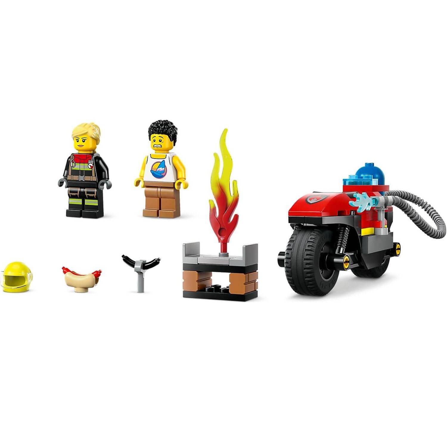 - What’s in the box? – This toy rescue vehicle playset has everything kids need to build a toy fire motorcycle, a barbecue-fire scene and 2 minifigures, including a female firefighter