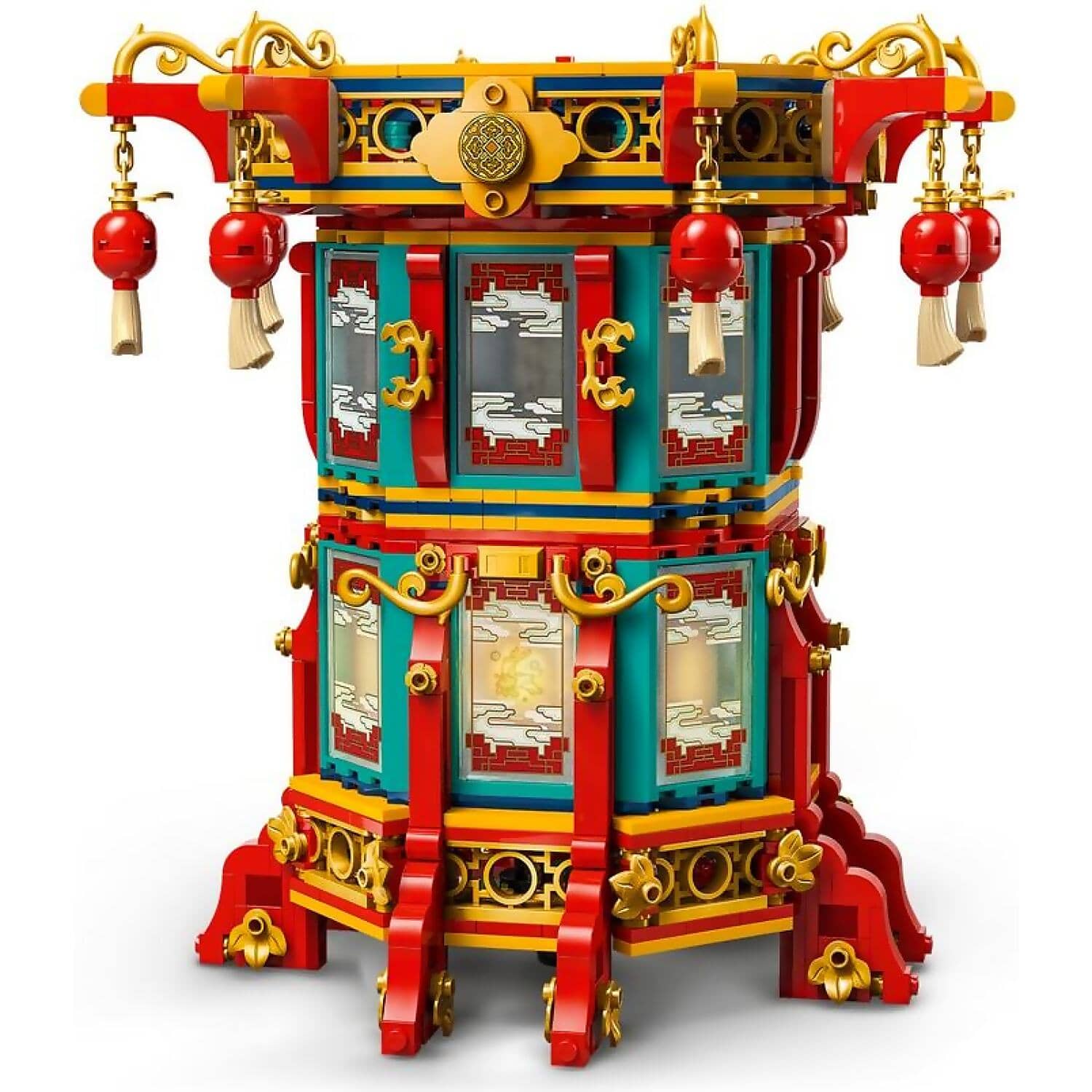 - Pretend-play toy – The top of the lantern is removable, and the removable upper tier folds out to reveal 3 minifigure-scale scenes featuring a food stall, decorations stall and a shadow theater