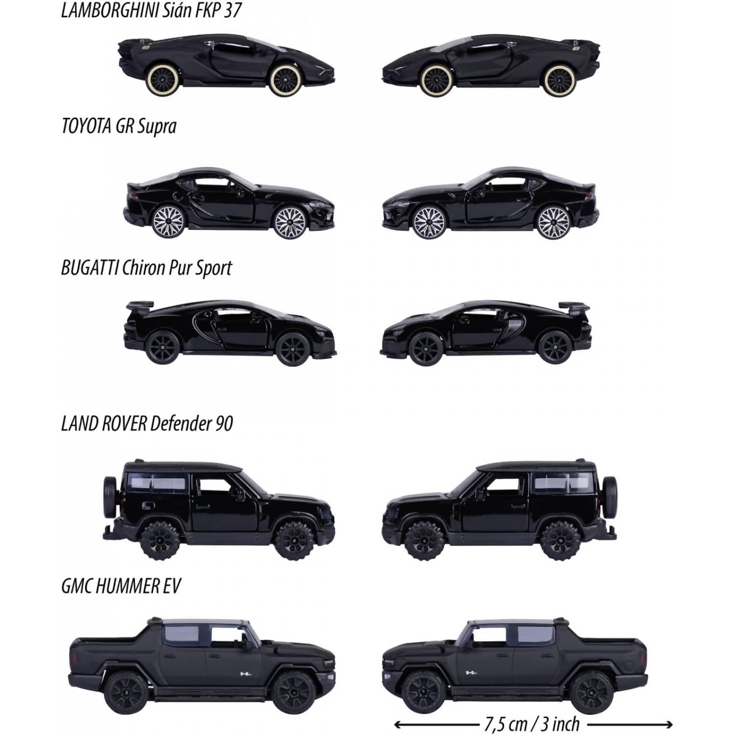 - Bumper set with 5 vehicles – This gift set includes 5 licensed model cars: 1. Bugatti Chiron Pur Sport, 2. Lamborghini Sián FKP 37, 3. Toyota GR Supra, 4. Land Rover Defender 90, and 5. GMC Hummer EV.